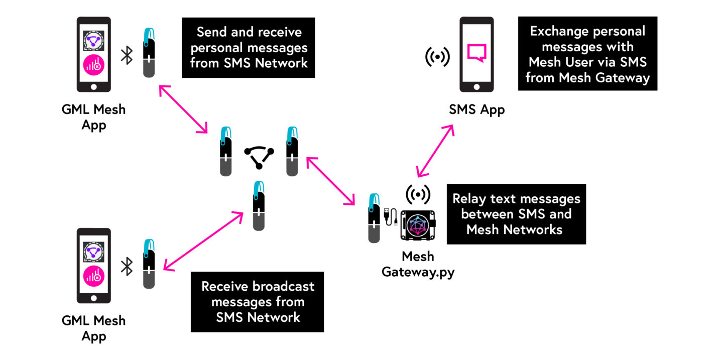 - Mesh users receive SMS messages sent as direct replies and broadcasts via the GML Mesh App.