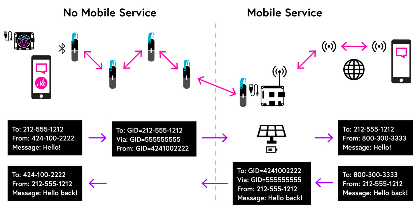 - Messages are sent over the goTenna network to the nearest Mesh Gateway device.